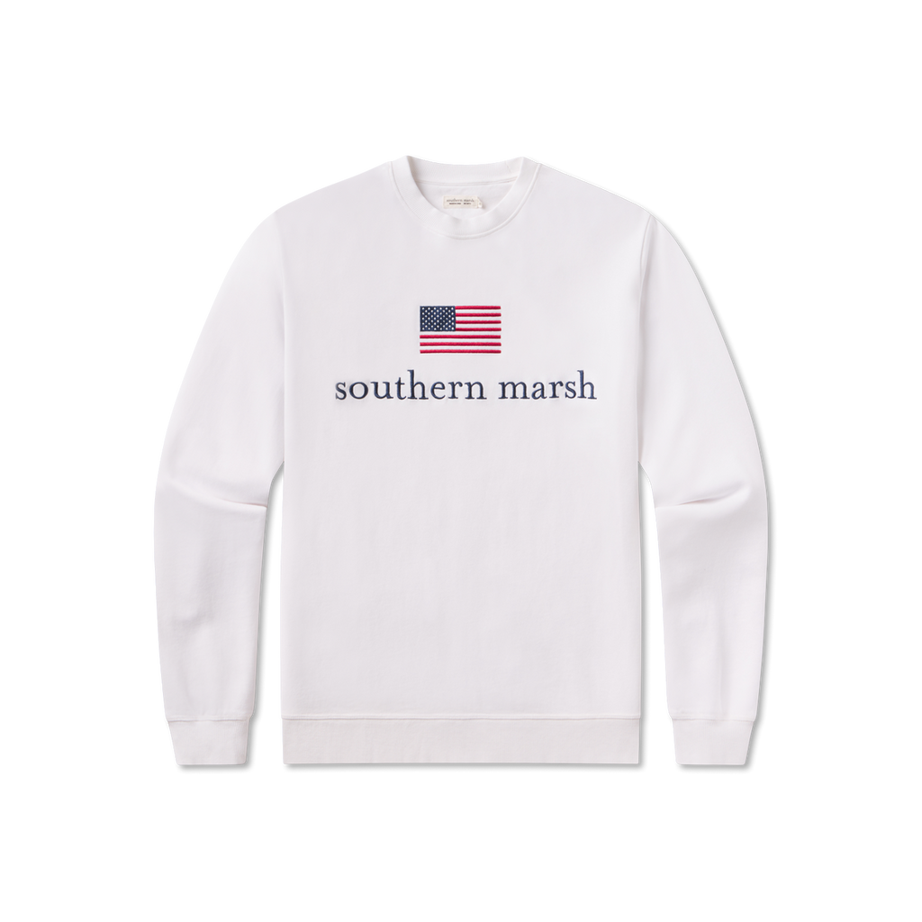 Our SEAWASH™️ Sweatshirt - American Flag combines casual comfort with a touch of patriotic style. Featuring an embroidered Southern Marsh logo and American flag design on the front, this lightweight 100% cotton sweatshirt is perfect for spring and summer activities. With ribbed cuffs and hem for a classic fit, it’s designed to keep you comfortable during casual gatherings, backyard BBQs, or hanging out with friends. A versatile addition to your wardrobe, this sweatshirt blends style and comfort effortlessly.